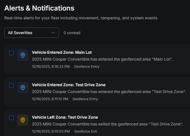 Yes. You can define geofences, test-drive zones, idle alerts, tamper alerts, and more.